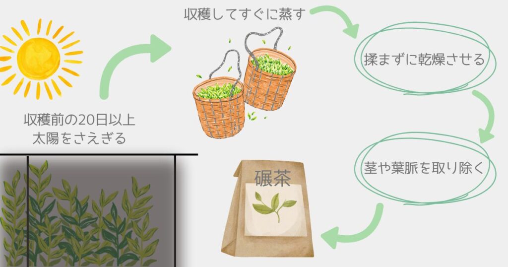 まず、てん茶は玉露と同じように、収穫前に日光を遮って育てられます。