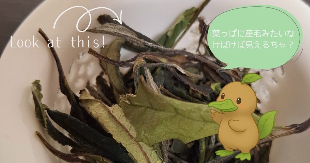 新芽や若い葉に生える、白茶の特徴である「毫毛(ごうもう)」と呼ばれる白い産毛のようなものが見られ、品質の良さが感じられました。